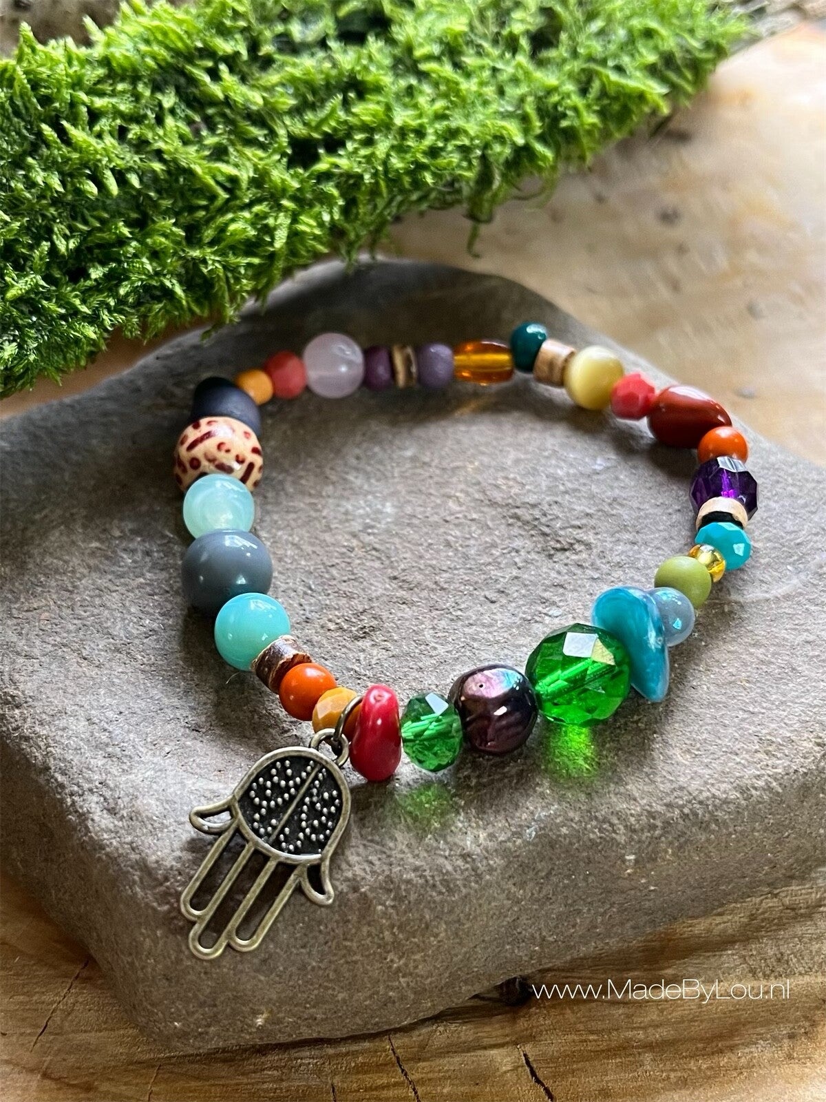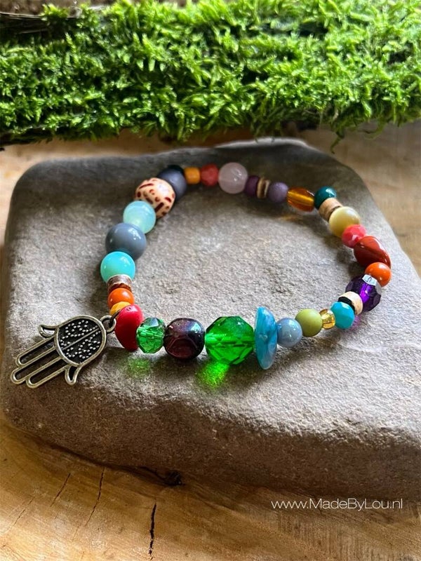 Materiaal: Diverde soorten kralen en tweedekans kralen met een metalen bedel. Nikkel vrij. Geregen op elastiek.