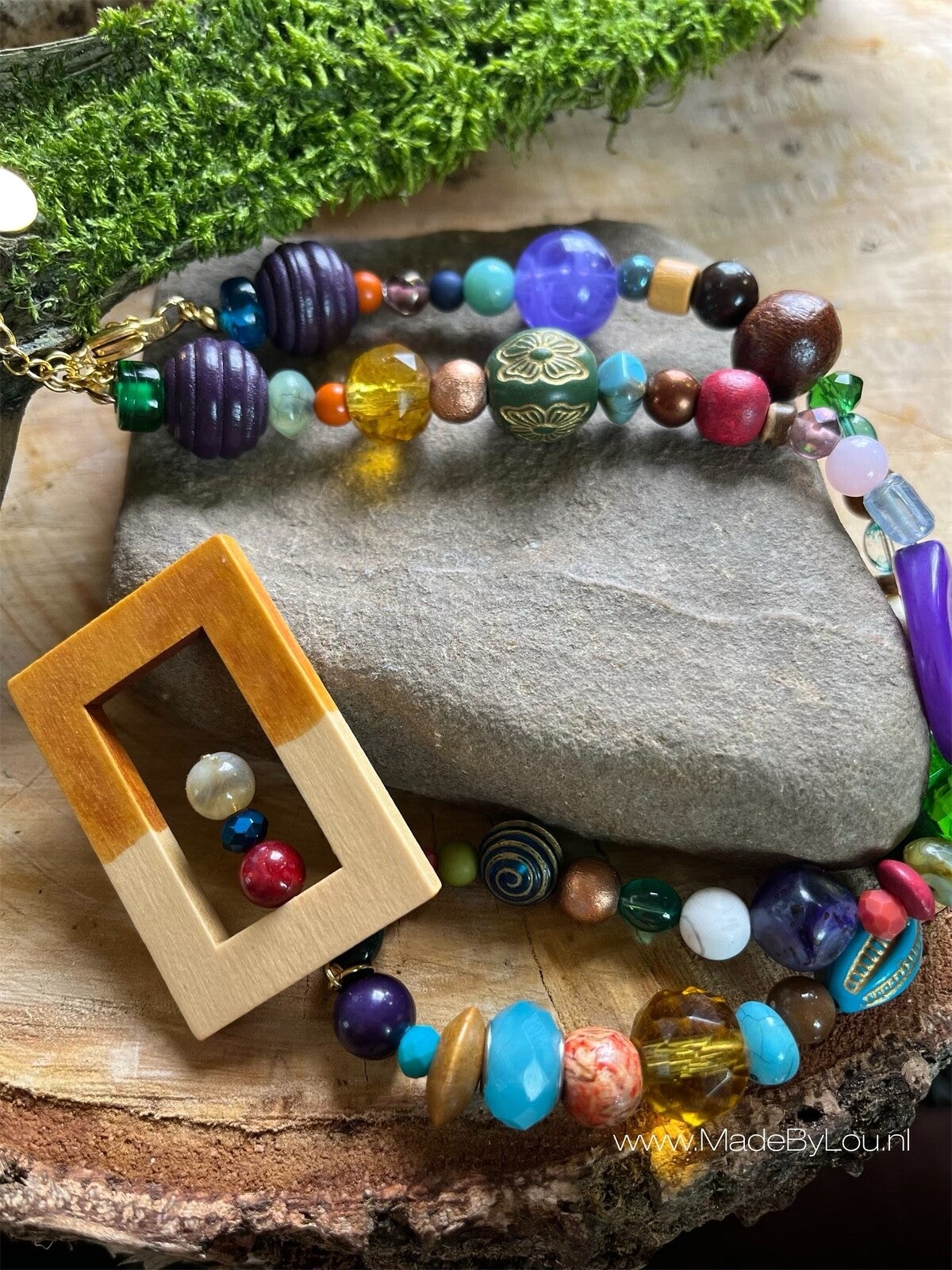 Materiaal: Stainless steel. Diverse soorten kralen en tweedekans kralen. Door middel van het sluit kettinkje kan je zelf bepalen op welke hoogte je de ketting draagt.
