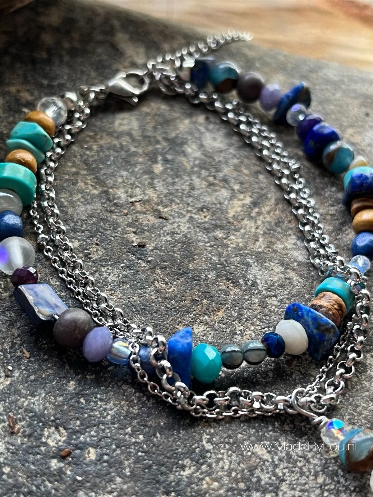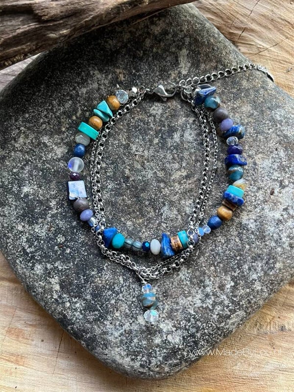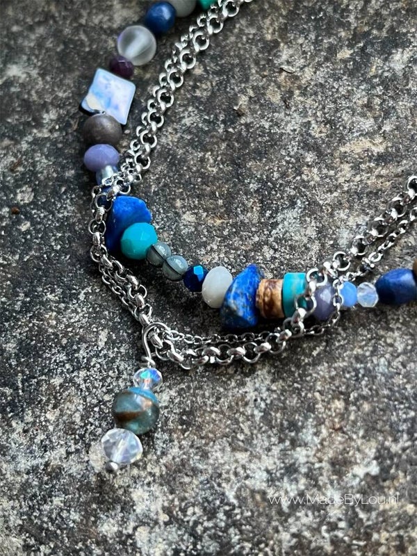 Materiaal: diverse soorten kralen en stainless steel met sluiting.