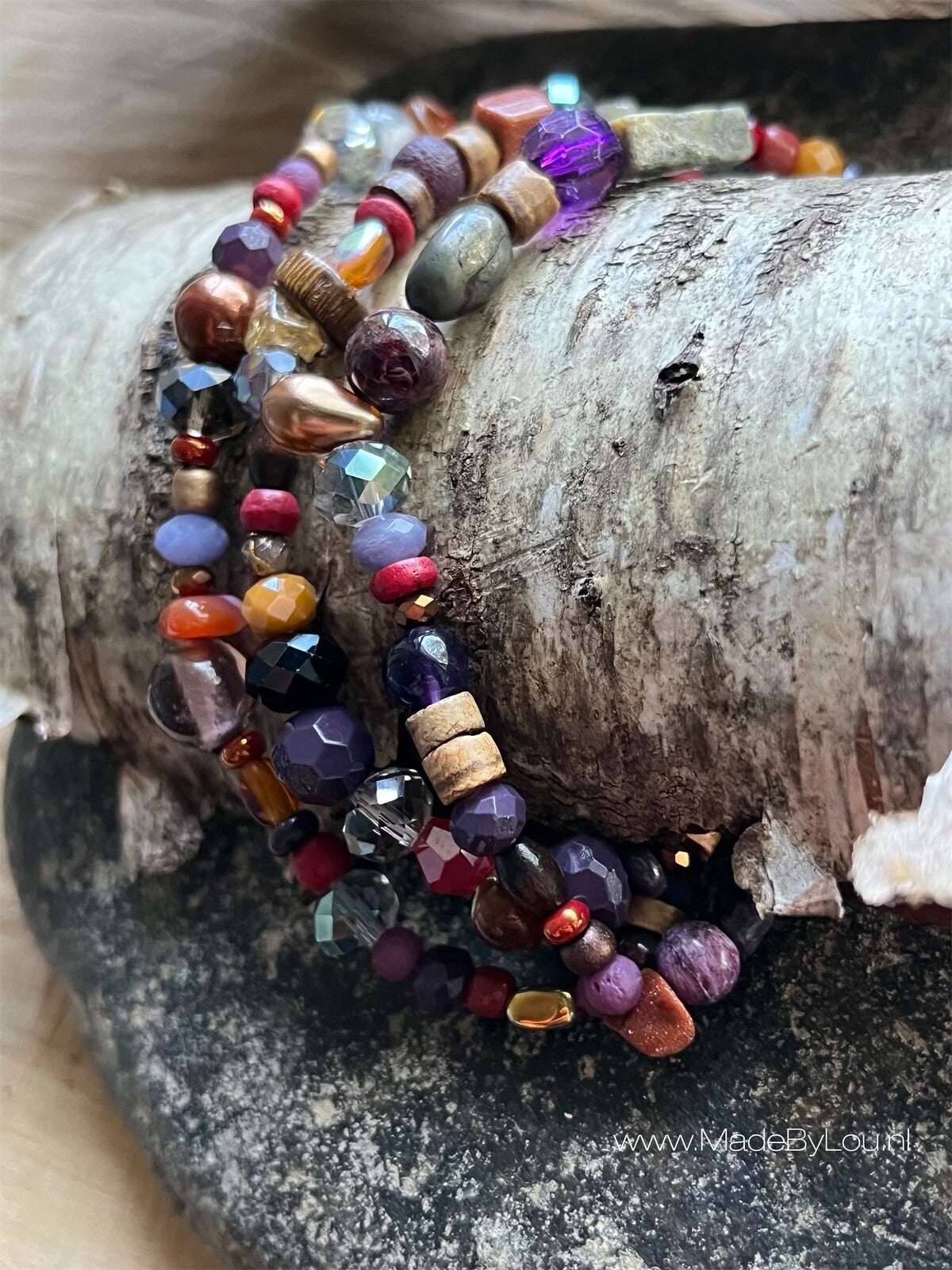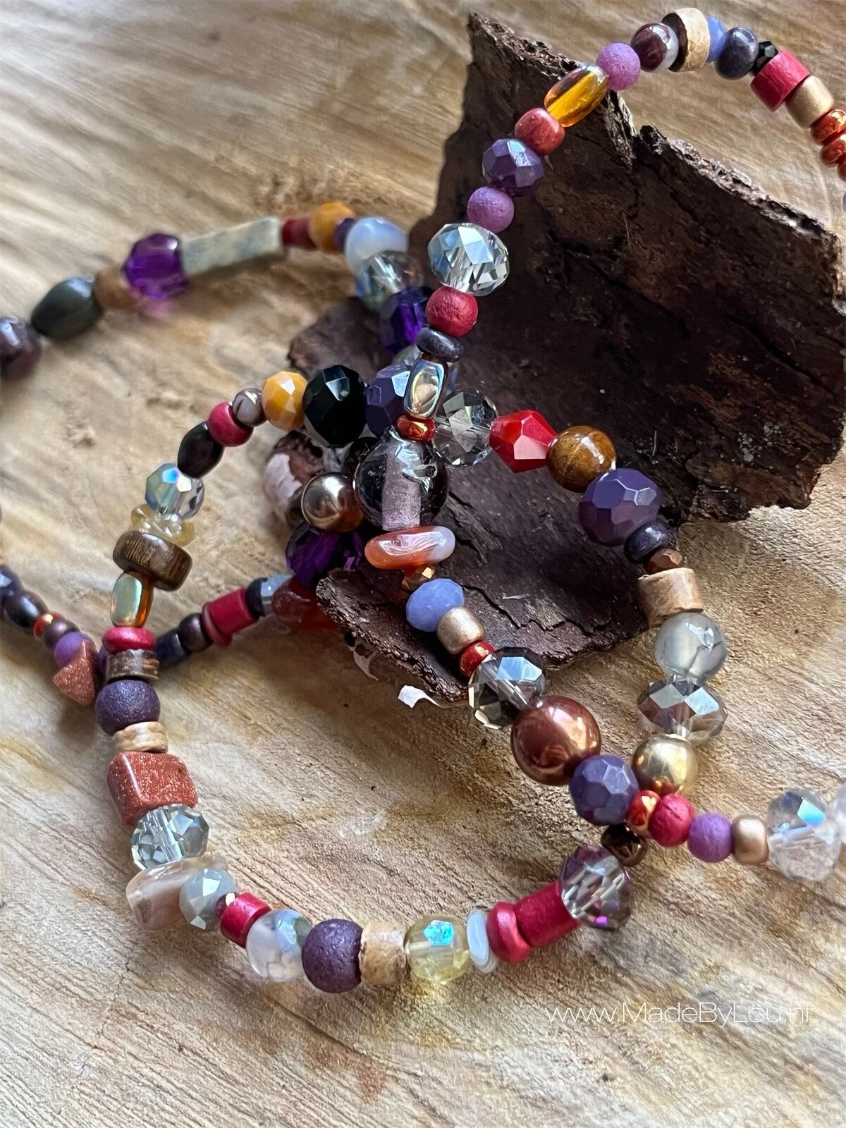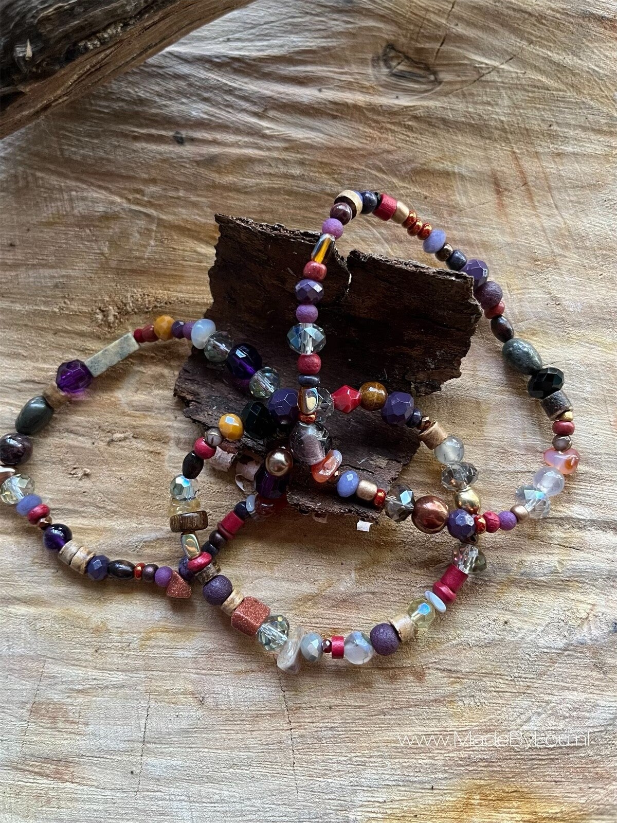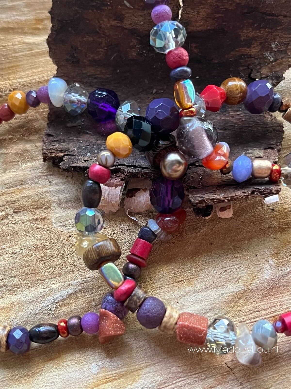 Materiaal: diverse soorten kralen op elastiek.