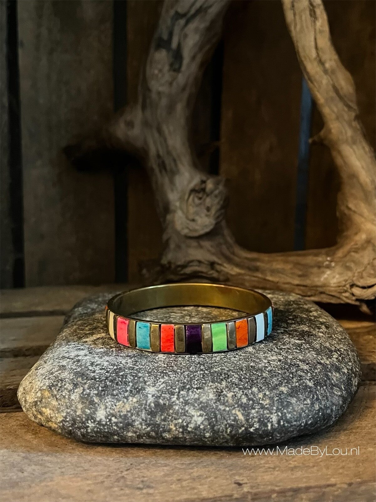 Mooie vintage armband van metaal met diverse kleuren. Middel breed.