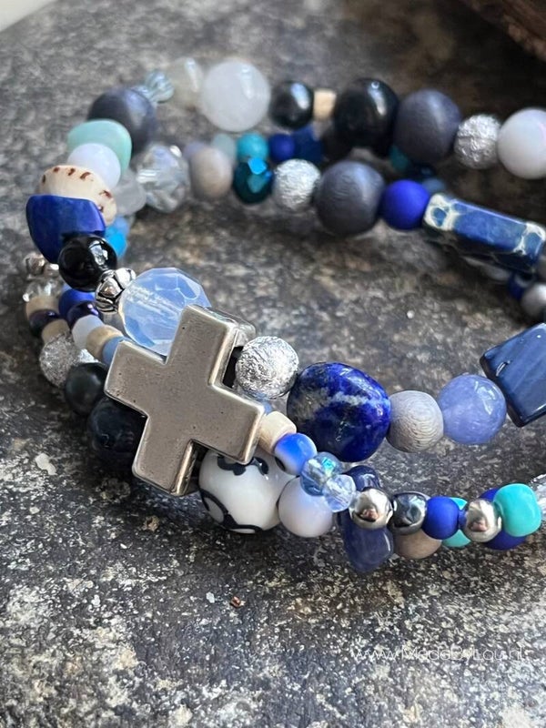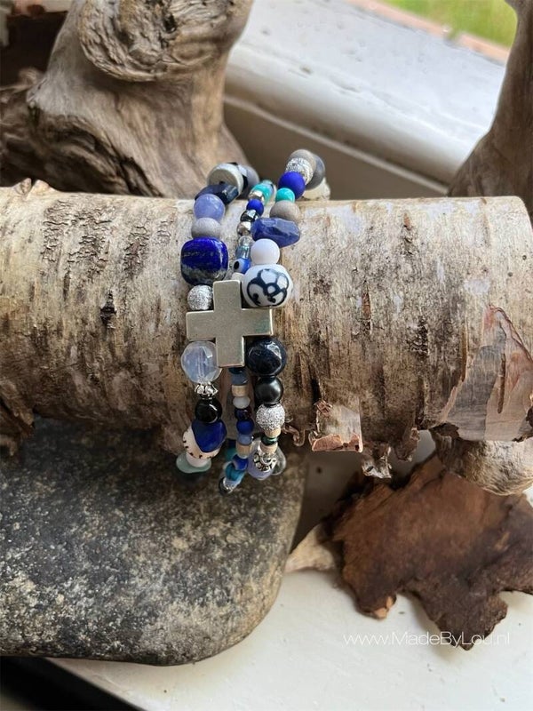Drie dubbele armband met een plus tegen in het midden die alles samenvoegt. Gemaakt op elastiek met verschillende soorten kralen. We noemen hem 'Udara' (Indonesisch)