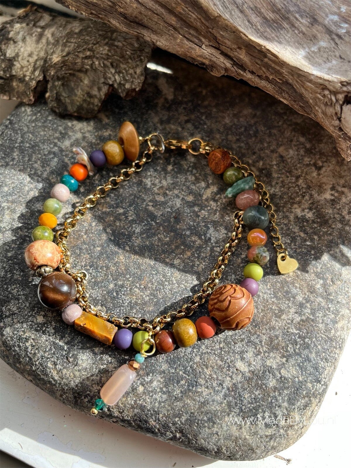 Prachtige stainless steel armband met geweldige mooie kleuren door diverse soorten kralen. Afgemaakt met een handgemaakte bedel van zonnesteen.