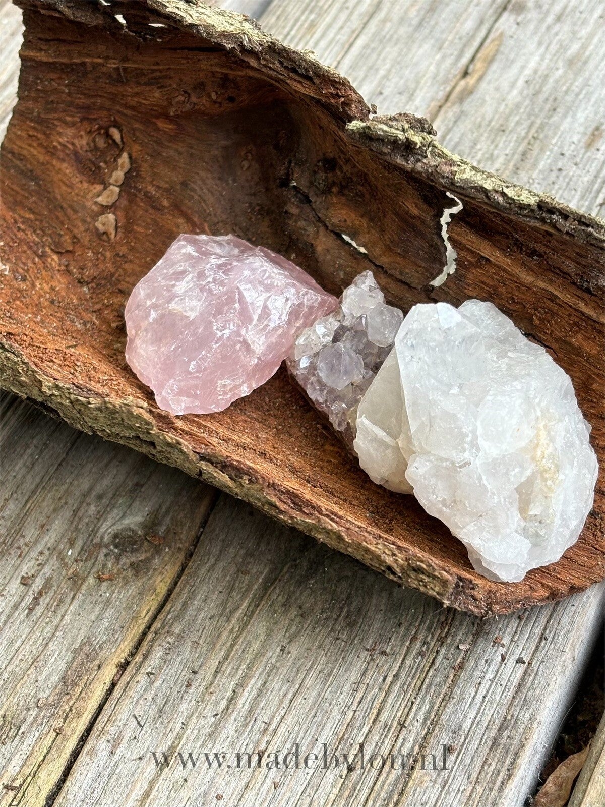 Amethist, rozenkwarts en bergkristal vormen samen de gouden driehoek. Deze krachtige kristallen versterken elkaar wanneer ze worden samen gebracht en geven samen méér energie. Samen zorgen ze voor liefde en harmonie doordat de drie-eenheid lichaam, geest en ziel verbindt. Hierdoor komt het lichaam beter in balans.