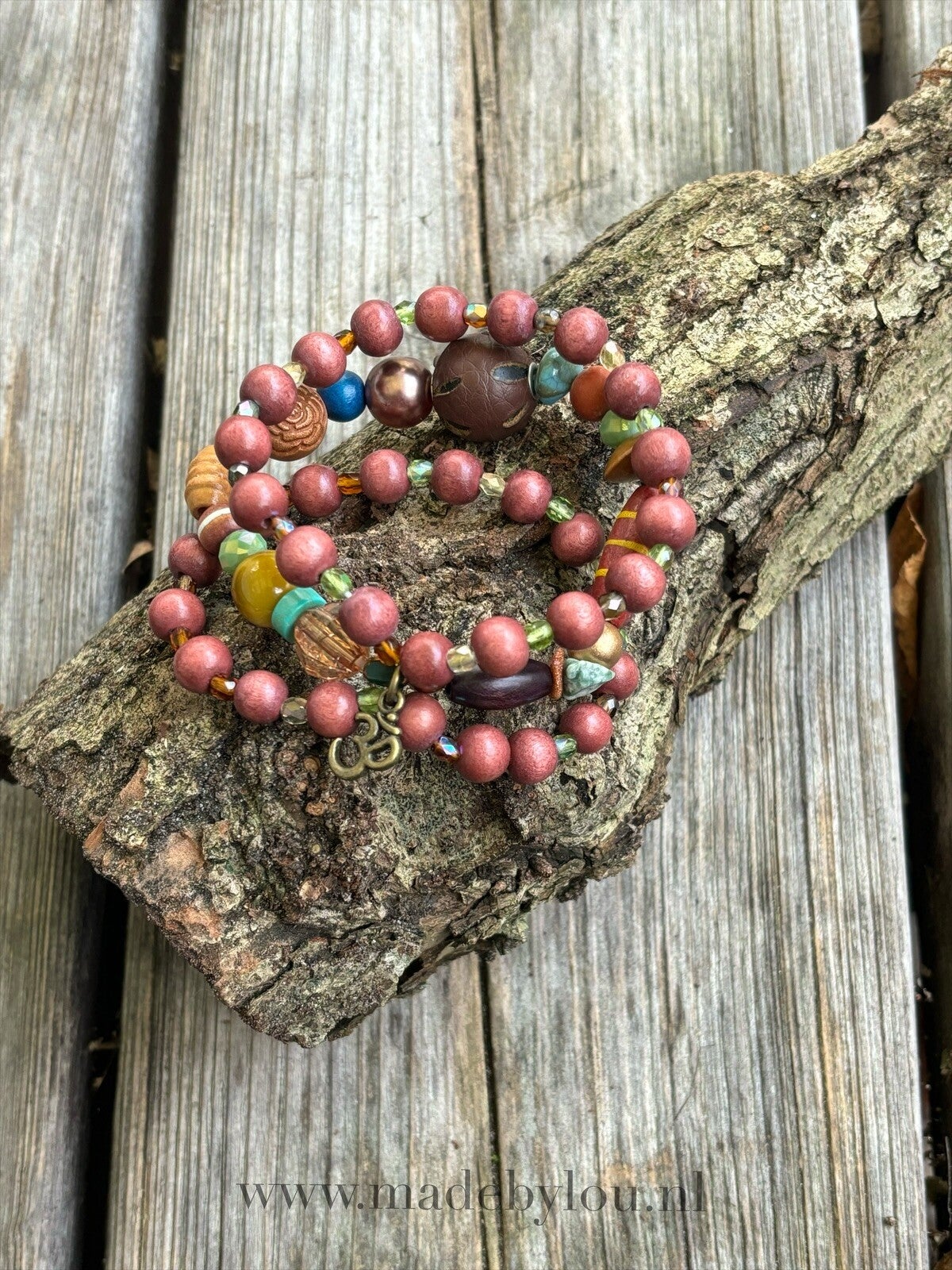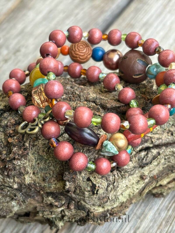 'Red' is een driedubbele armbanden met verschillende keuren en soorten kralen op elastiek. Prachtige kleuren die samen een prachtige maar rustig geheel vormen. Echt een eye-catcher.