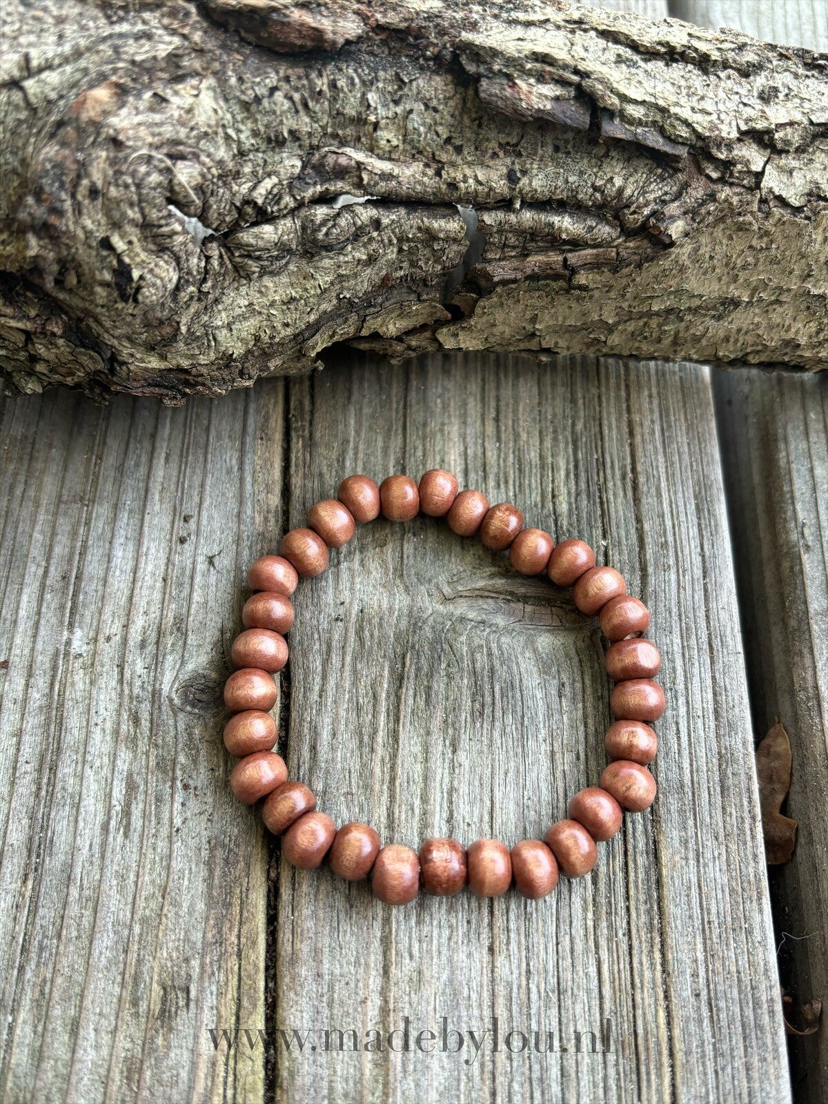 Deze armband is gemaakt met roodbruine houten kralen.