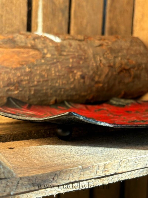 Rood stalen plateau in blad vorm voor allerlei doeleinden. Het staat op kleien ronde pootjes (zie foto)