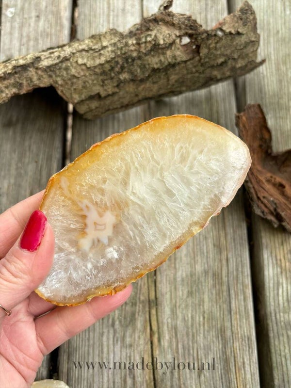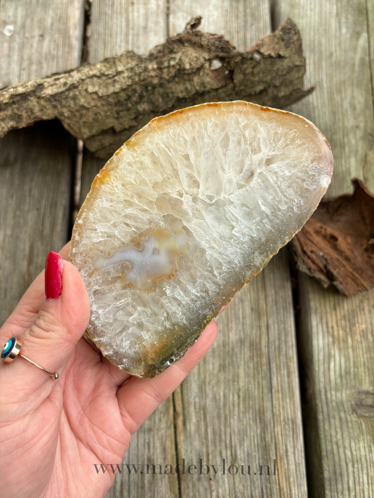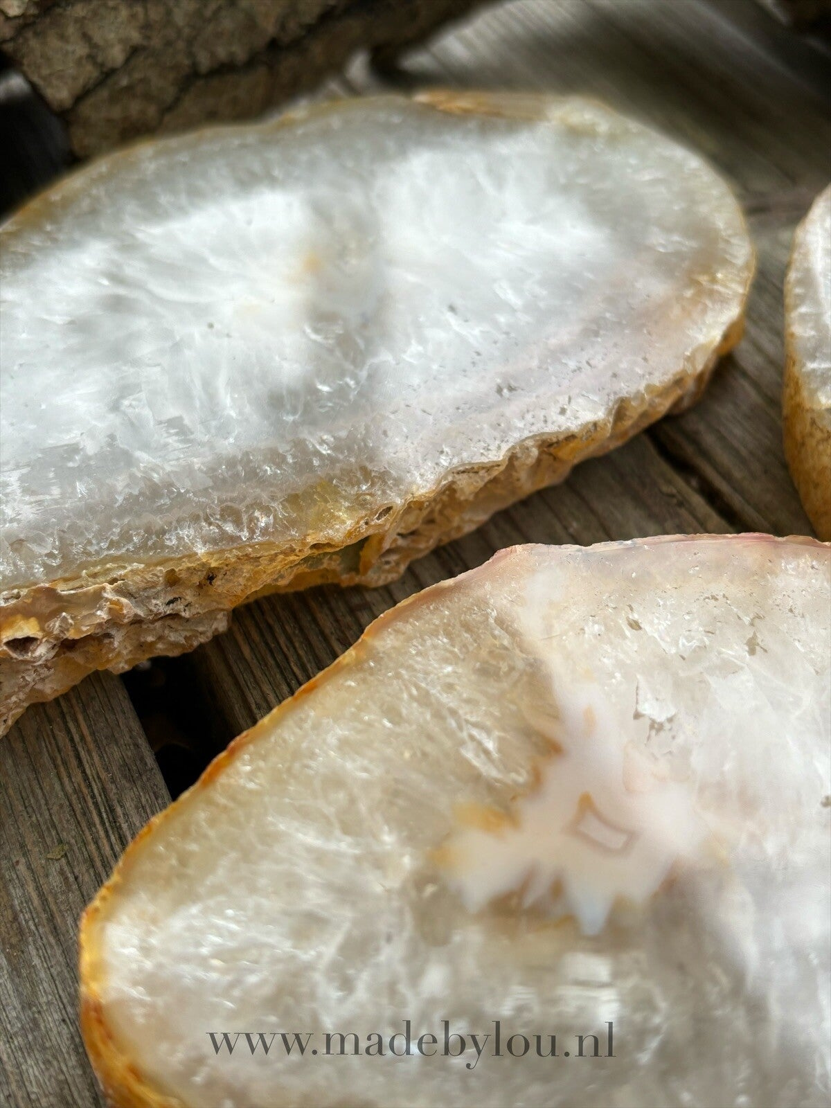 Mooie bergkristal schijf. Deze kan gebruikt worden om andere stenen op te laden, als onderzetter of gewoon als decoratie. Kernwoorden bergkristal: genezing, reiniging, harmonie, balans en positieve affirmaties.