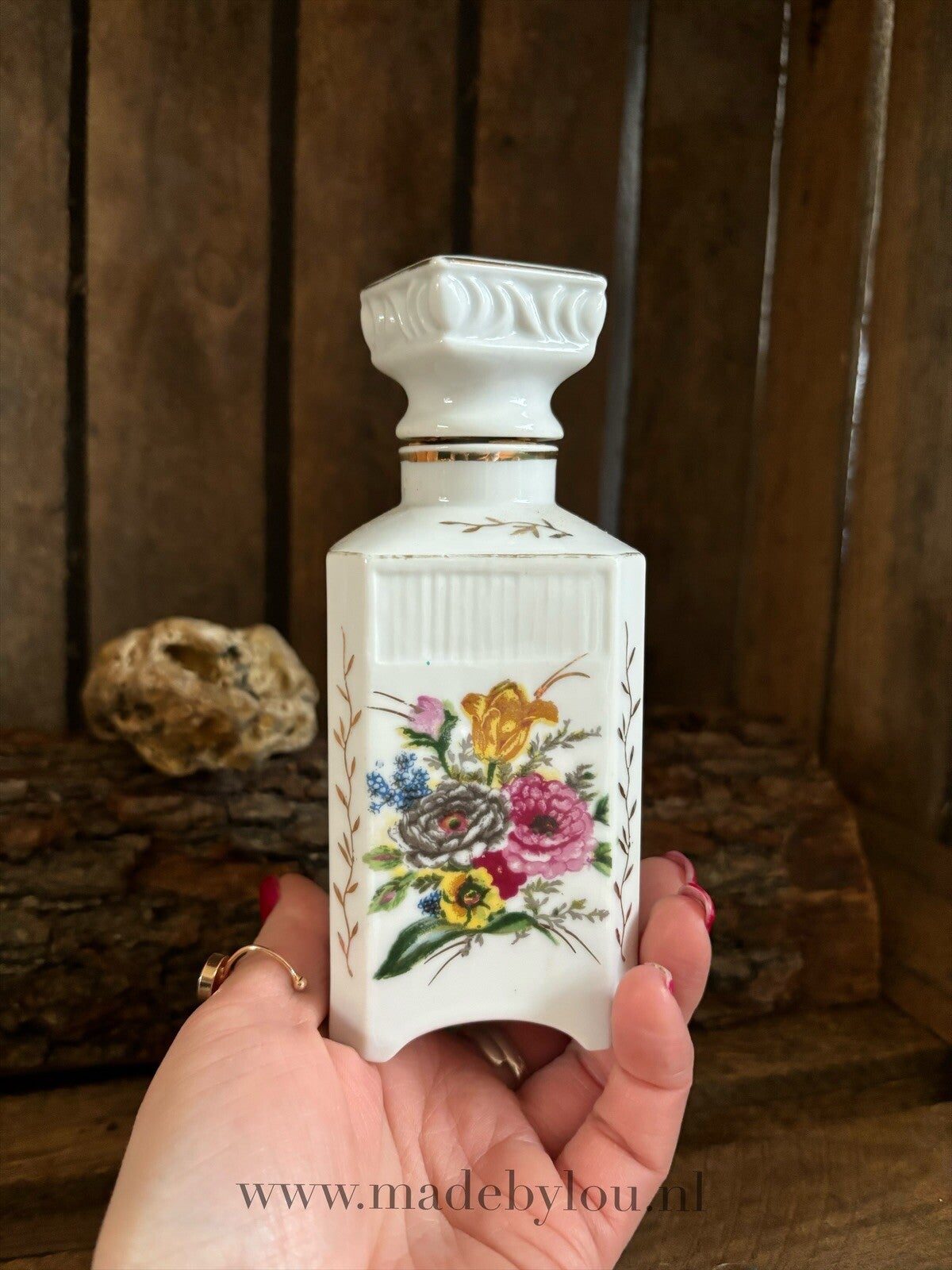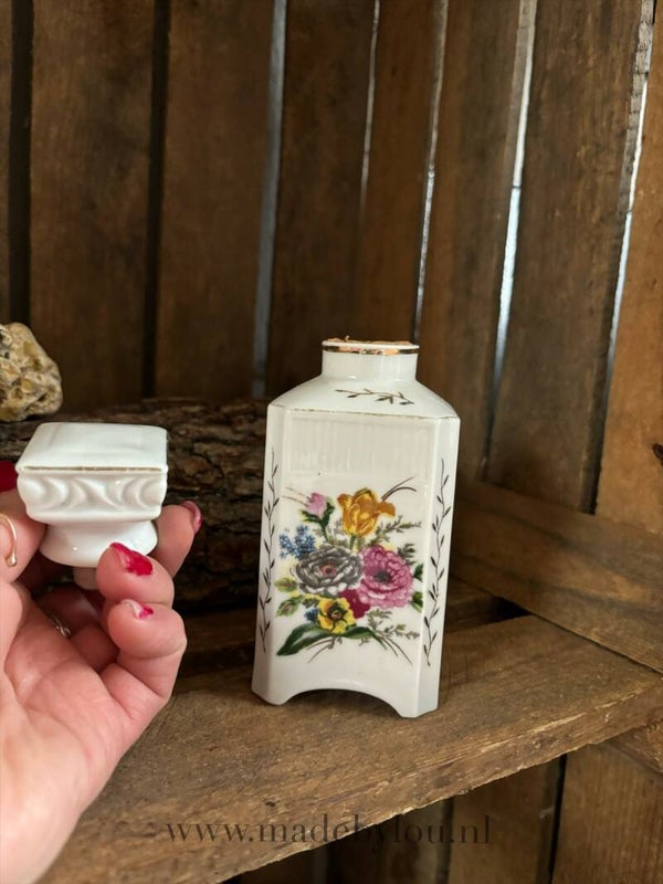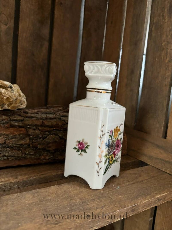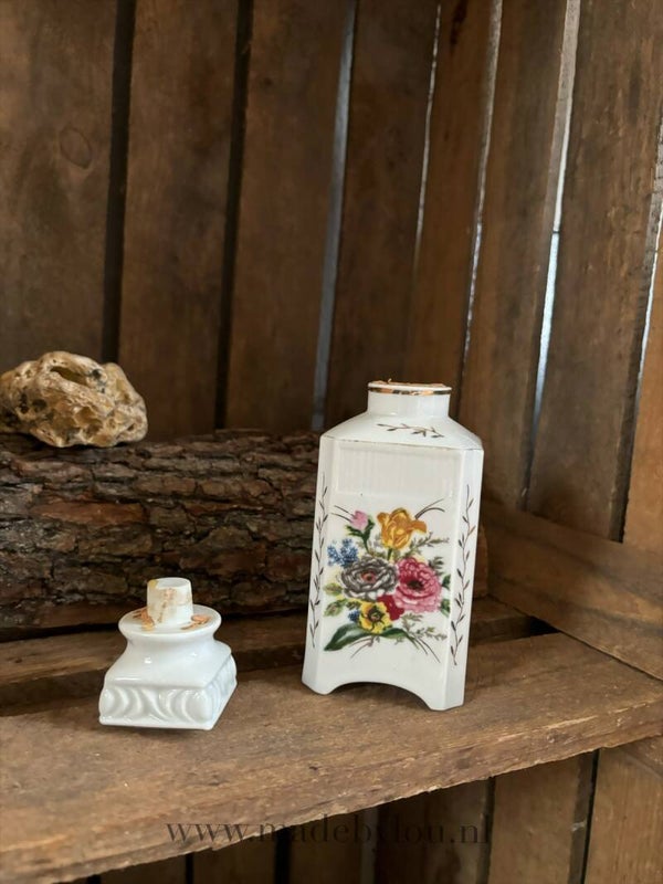 Mooie aardewerk kruik met bloemen motief en kurkdop. Ideaal voor bijvoorbeeld olie, geurwater of maanwater.