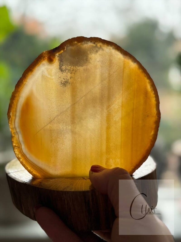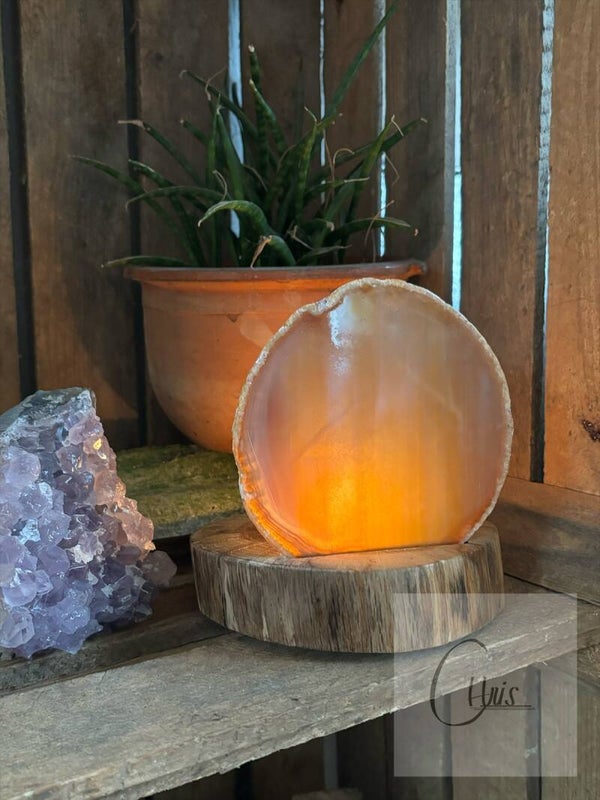 Prachtige handgemaakte agaat waxinelichthouder gemaakt van eiken hout een een grote agaat schijf.