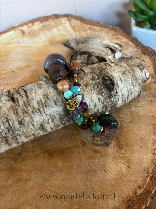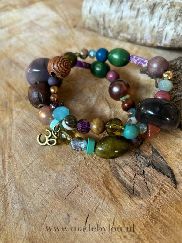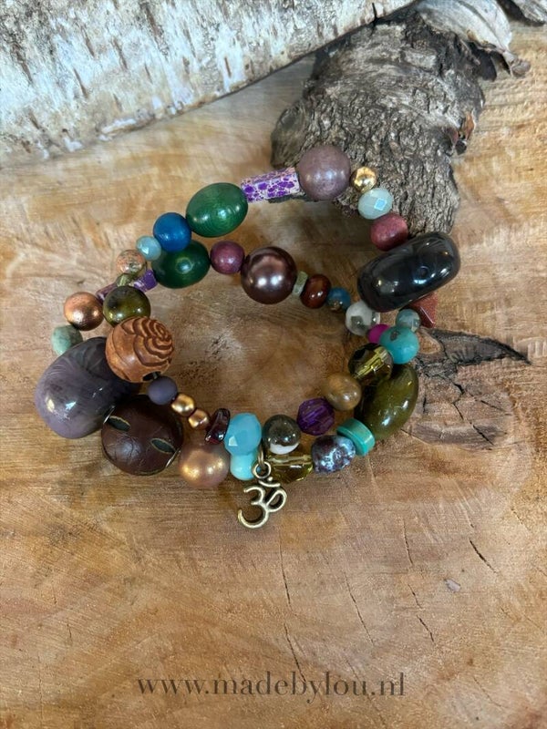 Prachtige dubbele armband met diverse soorten en kleuren klaren. Afgemaakt met een 'OHM' bedel.