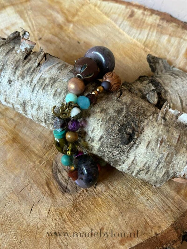 Materiaal: diverse soorten kralen op elastiek. En een brons kleurige bedel.