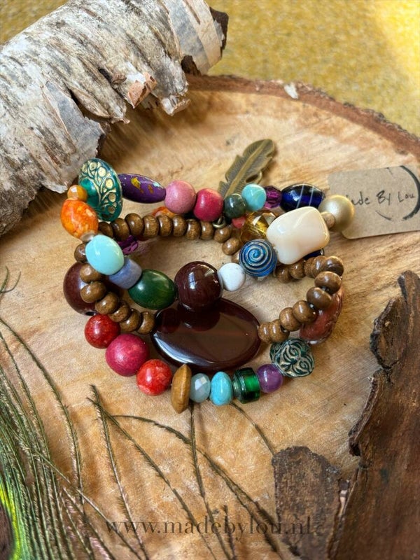 Prachtige agaat armband op elastiek. Verschillende soorten kralen, materialen en kleuren.