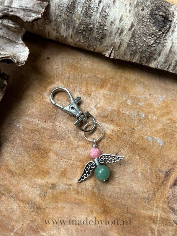 Diverse soorten handgemaakte engel sleutelhangers van edelsteen kralen.