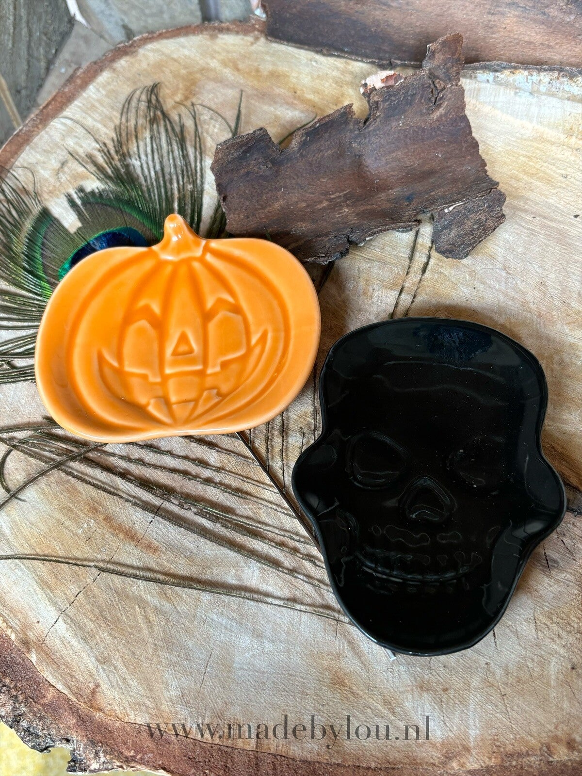 Twee kleine schaaltjes met een pompoen en een skull. Voor stenen, sieraden, snacks of bv theezakjes