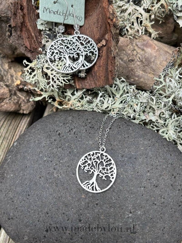 Oorbellen met levensboom hanger en bergkristal. Als set te dragen met de bijpassende ketting. (Apart verkrijgbaar)