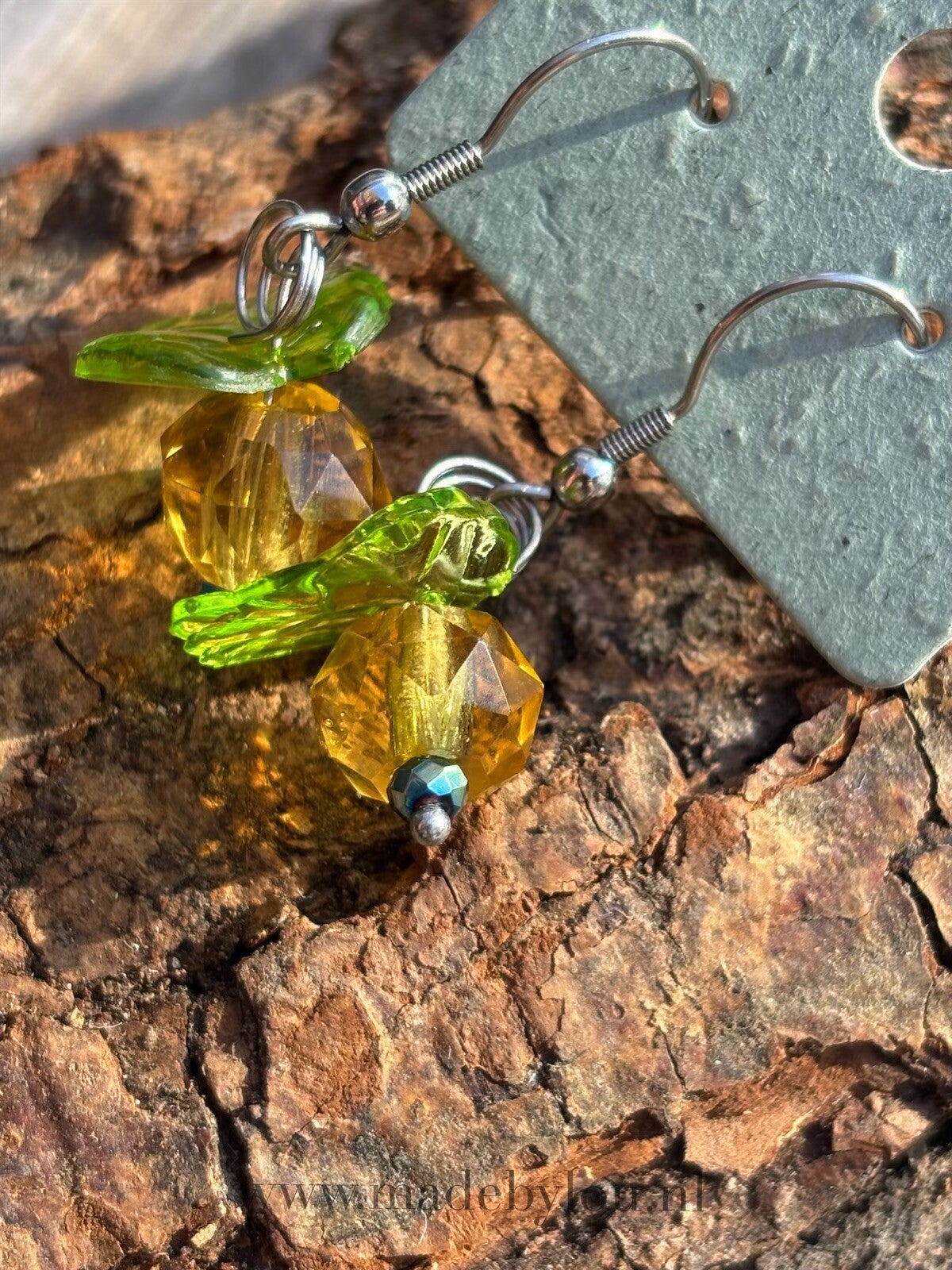 Materiaal: diverse kralen en stainless steel hangers.