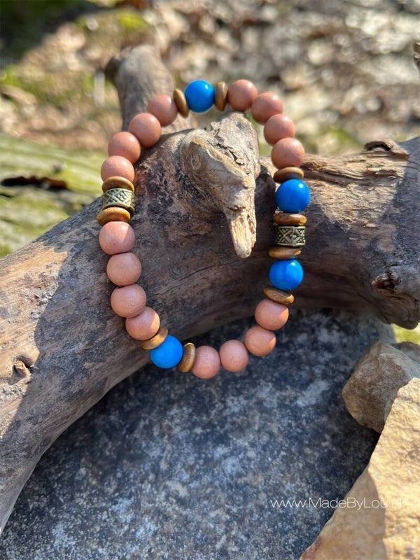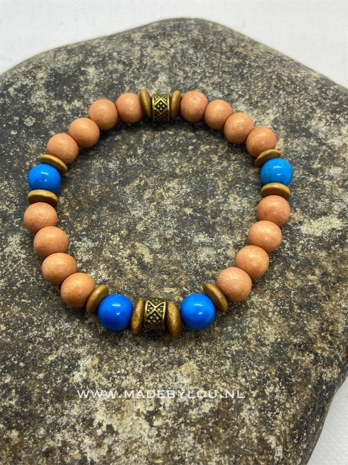 Materiaal: houtenkralen, natuursteen, metaal in brons kleur op elastiek. Nikkel vrij.