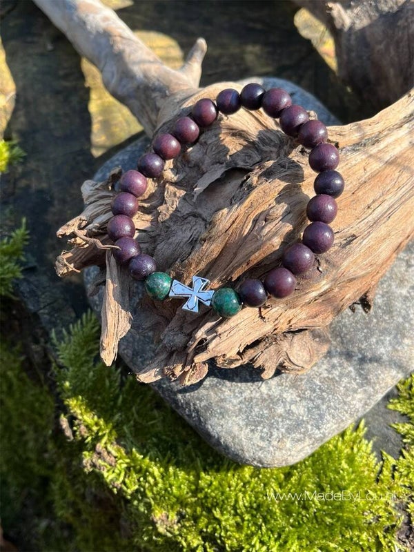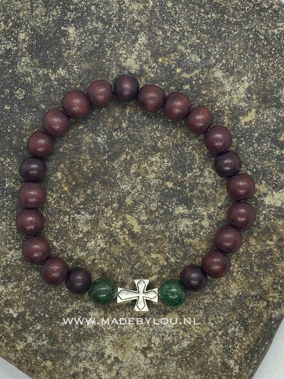 Soms is een simpele armband juist de mooiste. Deze unisex armband is gemaakt met houtenkralen, natuursteen en een zilver kleurig kruis. Simpel, maar prachtig.