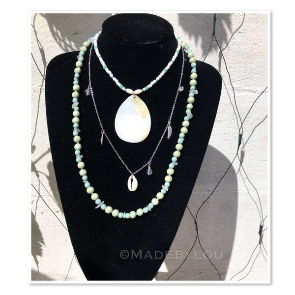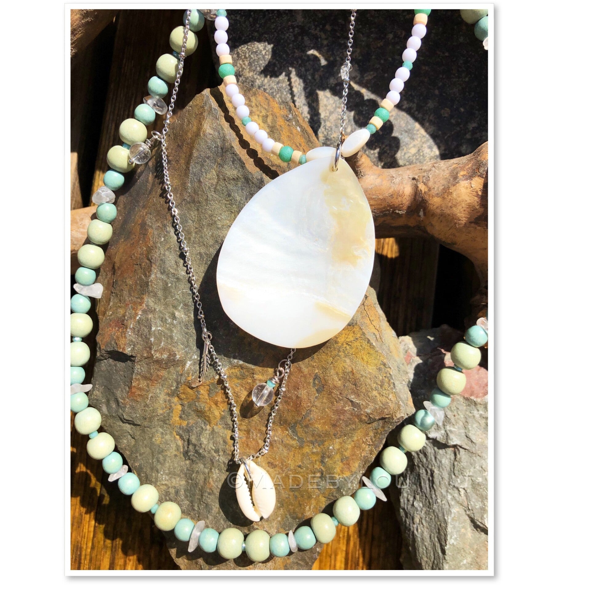 Het is gemaakt met houten kralen, schelpen, metaal en stainless steal onderdelen en bergkristal.